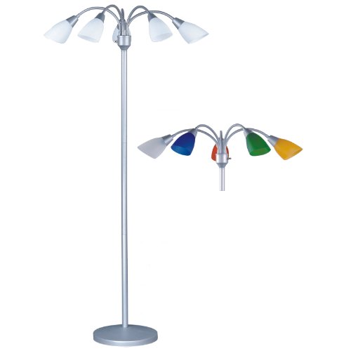 This contemporary floor lamp is perfect for any general lighting area. It features a contemporary design and a gorgeous silver finish. Perfect for any room in your home. The fully adjustable shades allow it to be positioned in a lot of different ways. It come complete with white or color shades so you can design the floor lamp any way you want-either all white or color shades. It has a 3 way turn knob switch. It is UL listed. Bulbs not included.
